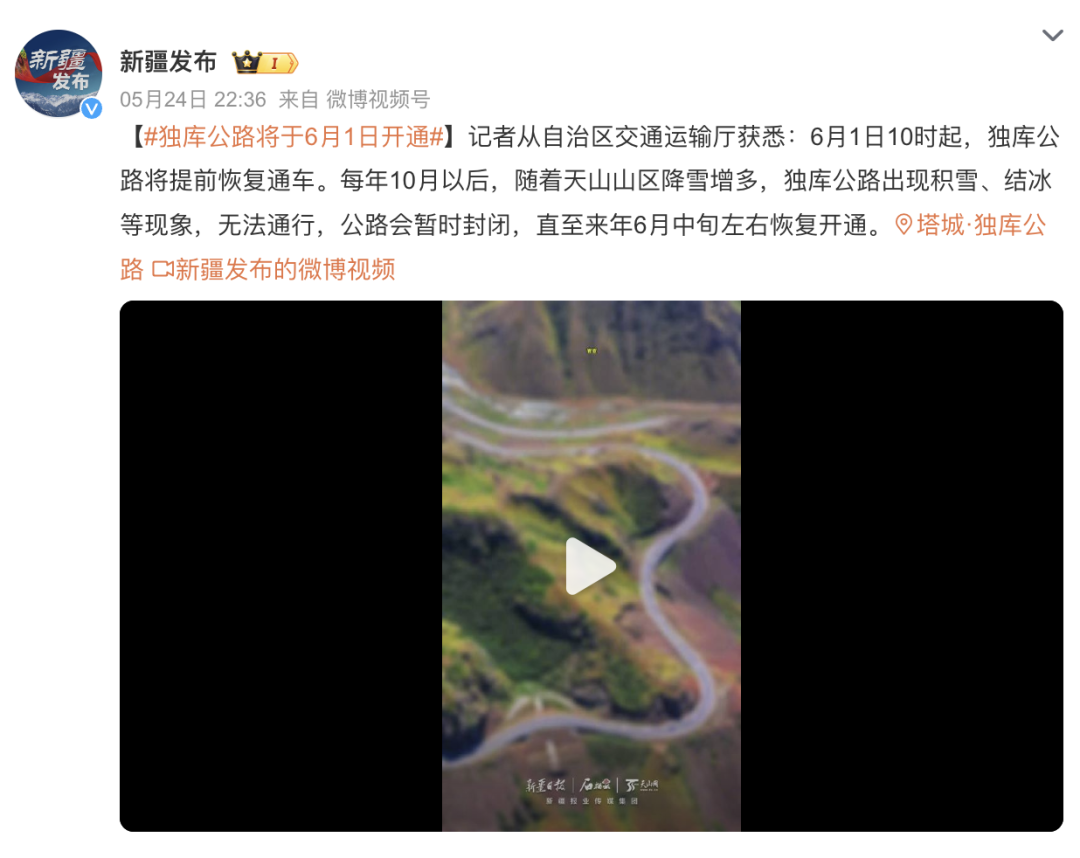 據新疆發布微博官宣,獨庫公路計劃將于2024年6月1日10時起,開放通車。車主朋友們又可以快樂的出發了!