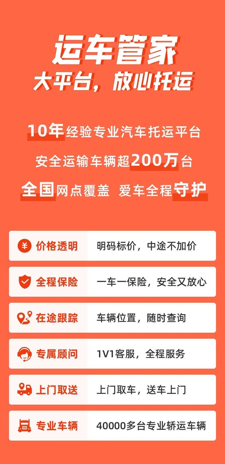 全程保險保障:給每一臺車購買足額運輸保險,小剮小蹭或重大事故都可以理賠。每年運輸這么多汽車,車損是小概率事件,大家不用過分擔心。